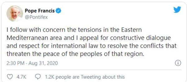 Doğu Akdeniz'de yaşanan gerilime ilişkin Papa Francis sosyal medya hesabından açıklamada bulundu. Twitter'dan paylaşım yapan Francis, Doğu Akdeniz'de yaşanan gelişmeleri endişeyle takip ettiğini belirterek, bölge halklarının barışını tehdit eden çatışmaların çözülmesi için diyalog ve uluslarası hukuka saygı çağrısında bulundu. Papa, mesajında Yunanistan'ın Doğu Akdeniz'deki haksız istemlerine değinmezken, silahlandırılmaması gereken adaların silahlandırılmasına ilişkin de konuşmadı.