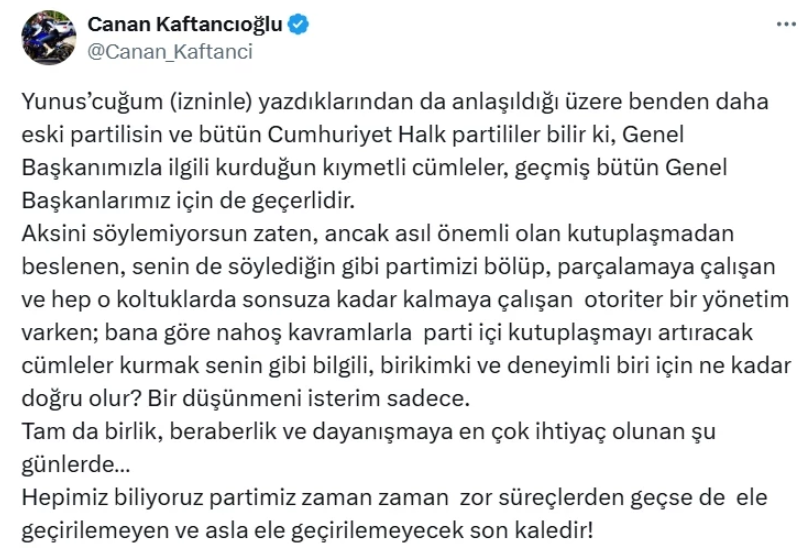 Bu paylaşıma kızan eski CHP İstanbul İl Başkanı ve Kemal Kılıçdaroğlu'na yakınlığıyla bilinen Canan Kaftancıoğlu, "Bana göre nahoş kavramlarla parti içi kutuplaşmayı artıracak cümleler kurmak senin gibi bilgili, birikimli ve deneyimli biri için ne kadar doğru olur? Bir düşünmeni isterim sadece. Tam da birlik, beraberlik ve dayanışmaya en çok ihtiyaç olunan şu günlerde… Hepimiz biliyoruz partimiz zaman zaman zor süreçlerden geçse de ele geçirilemeyen ve asla ele geçirilemeyecek son kaledir!" cevabını verdi.