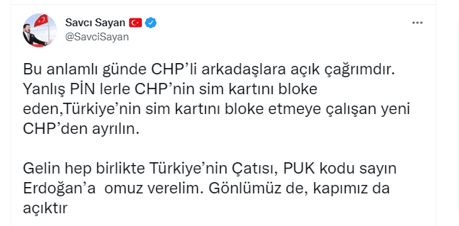 "Bu anlamlı günde CHP’li arkadaşlara açık çağrımdır. Yanlış PİN lerle CHP’nin sim kartını bloke eden,Türkiye’nin sim kartını bloke etmeye çalışan yeni CHP’den ayrılın.