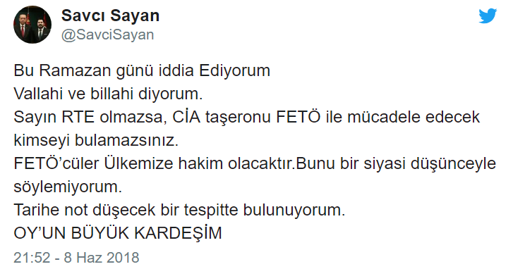 Savcı Sayan, sosyal medyadan yayınladığı paylaşımda "Erdoğan olmazsa FETÖ ile mücadele edecek kimseyi bulamazsınız!" dedi.