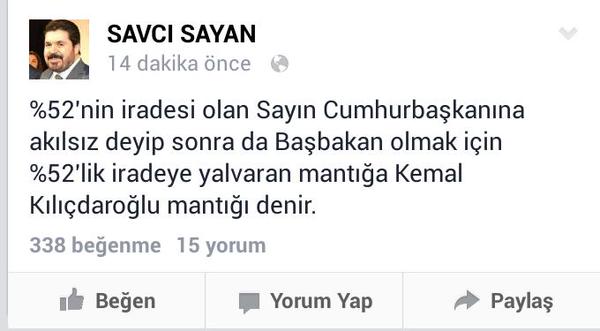 AK Parti'den 7 Haziran seçimleri için aday adayı olan Savcı Sayan Twitterda yaptığı paylaşımda '%52'nin iradesi Cumhurbaşkanına akılsız deyip sonra da Başbakan olmak için &52'lik iradeye yalvaran mantığa Kemal Kılıçdaroğlu mantığı denir' diyerek Kılıçdaroğlu'nun kenidisyle bile zıt düştüğünü ortaya çıkardı.