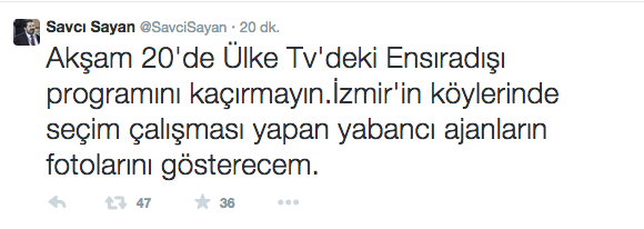 Sayan, mesajında yabancı ajanların İzmir'in köylerinde çektiği fotoğrafları kamuoyuna açıklayacağını kaydetti.