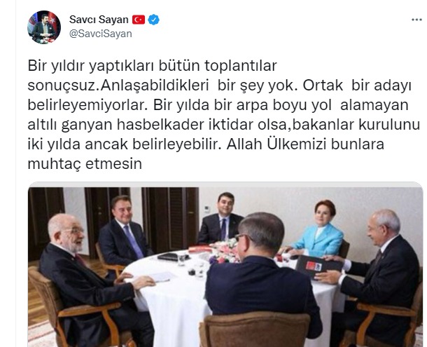 6'lı masanın Saadet Partisi Genel Başkanı Temel Karamollaoğlu'nun ev sahipliğinde gerçekleştirdiği son toplantısında da "aday" açıklanmayınca eleştiride bulunan Ağrı Belediye Başkanı Savcı Sayan, "Altılı ganyan hasbelkader iktidar olsa, Bakanlar Kurulu'nu iki yılda ancak belirleyebilir." dedi.
