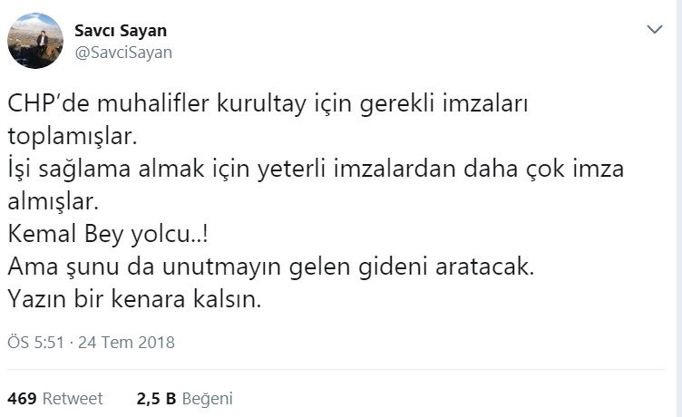 Sosyal medya hesabından paylaşım yapan Savcı Sayan, "CHP’de muhalifler kurultay için gerekli imzaları toplamışlar. İşi sağlama almak için yeterli imzalardan daha çok imza almışlar. Kemal Bey yolcu..! Ama şunu da unutmayın gelen gideni aratacak. Yazın bir kenara kalsın." ifadelerinde bulundu.