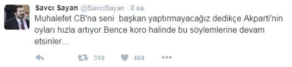 Sayan, "Muhalefet Cumhurbaşkanı'na 'Seni Başkan yaptırmayacağız' dedikçe AK Parti'nin oyları hızla artıyor. Bence koro halinde bu söylemlerine devam etsinler..." ifadelerini kullandı.