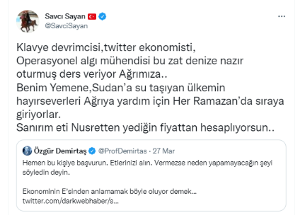 Ağrı Belediye Başkanı Savcı Sayan, Twitter hesabından kendisini hedef alan Özgür Demirtaş'a, bir daha ağzını açamayacağı şekilde had bildirdi.