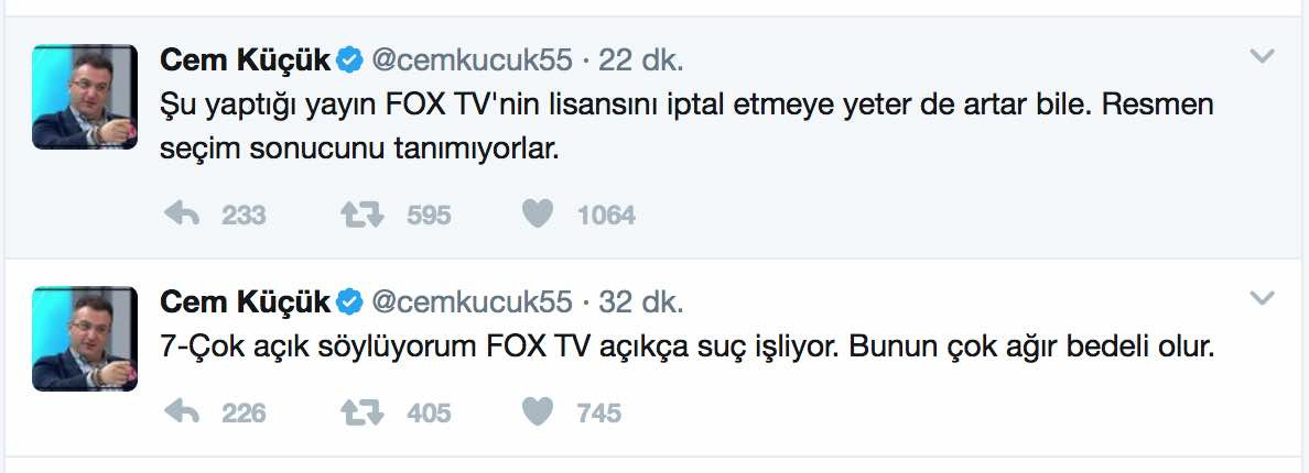 Fox TV’nin referandumun sonucunu provoke edip meşruiyetini sarsmaya dönük yayınlarının savcılık tarafından incelemeye alındığı ve lisansının iptal edilebileceği iddia edildi. Gazeteci Cem Küçük’ten çarpıcı yorumlar…