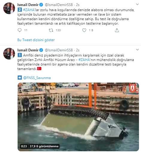 Demir yaptığı paylaşımda "Amfibi deniz piyademizin ihtiyaçlarını karşılamak için özel olarak geliştirilen Zırhlı Amfibi Hücum Aracı'nın (ZAHA) mühendislik doğrulama faaliyetlerinde önemli bir aşama olan kendini düzeltme testi başarıyla tamamlandı" ifadelerini kullandı.