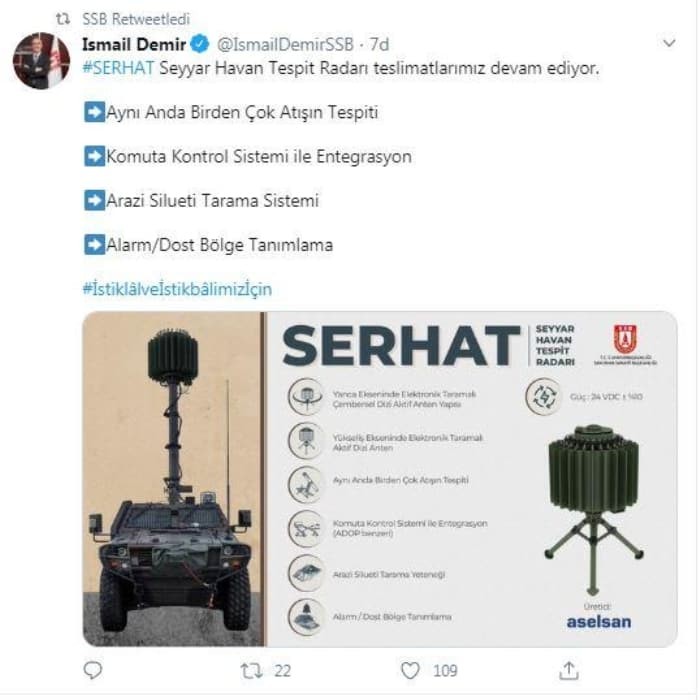 Savunma Sanayii Başkanı İsmail Demir, Seyyar Havan Tespit Radarı (SERHAT) teslimatlarının devam ettiğini bildirdi.