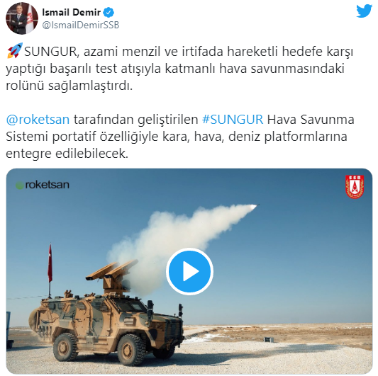 Alçak İrtifa Hava Savunma Sistemi hakkında müjdeli haberi veren Savunma Sanayii Başkanı İsmail Demir, "SUNGUR, azami menzil ve irtifada hareketli hedefe karşı yaptığı başarılı test atışıyla katmanlı hava savunmasındaki rolünü sağlamlaştırdı." açıklamasında bulundu.