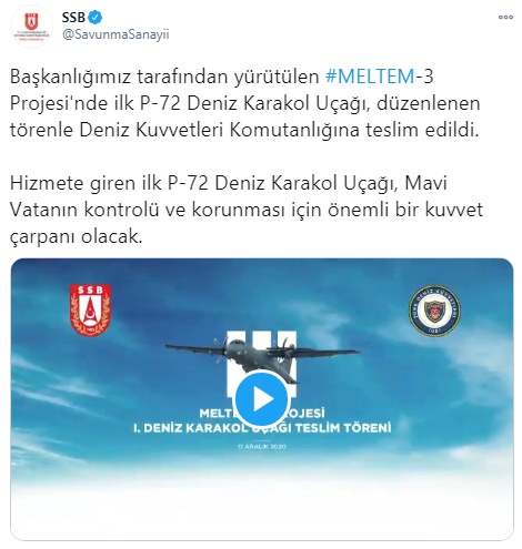 Cumhurbaşkanlığı Savunma Sanayii Başkanlığı (SSB) tarafından yürütülen Meltem-3 Projesi'nde ilk P-72 Deniz Karakol Uçağı, düzenlenen törenle Deniz Kuvvetleri Komutanlığına teslim edildi.