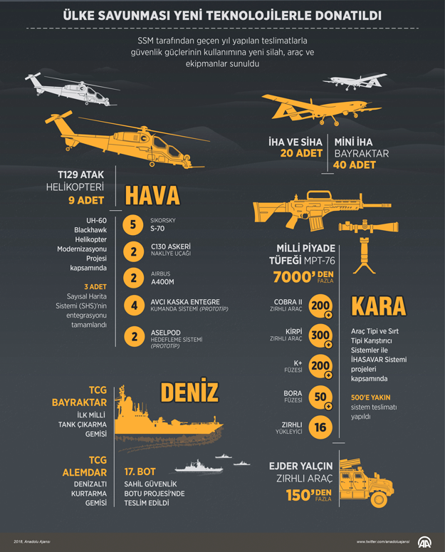 Savunma sanayiinde yerlilik oranı artıyor. ATAK, İHA, TCG Bayraktar ve MPT-76 gibi ürünler terörle mücadelede önemli görev görüyor. İşte silahlarımız ile ilgili infografik: