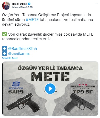 Savunma Sanayii Başkanı Başkanı İsmail Demir, Twitter hesabından yaptığı paylaşımda, "Özgün Yerli Tabanca Geliştirme Projesi kapsamında üretimi süren Mete tabancalarımızın teslimatlarına devam ediyoruz. Son olarak güvenlik güçlerimize çok sayıda Mete tabancalarından teslim ettik." ifadelerini kullandı.