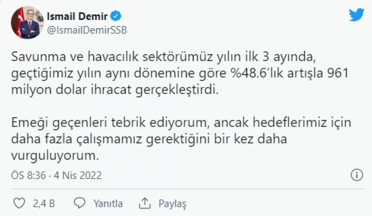 Demir, "Savunma ve havacılık sektörümüz yılın ilk 3 ayında, geçtiğimiz yılın aynı dönemine göre yüzde 48,6’lık artışla 961 milyon dolar ihracat gerçekleştirdi. Emeği geçenleri tebrik ediyorum, ancak hedeflerimiz için daha fazla çalışmamız gerektiğini bir kez daha vurguluyorum" dedi.