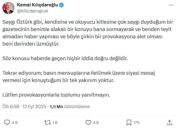 CHP'deki sürece rağmen sessizliğini koruyan ve hiçbir açıklamada bulunmayan Kılıçdaroğlu, Öztürk'ün yazısına sessiz kalmadı. Sosyal medya hesabından paylaşım yapan eski CHP lideri, açıklamasında sert ifadeler kullandı.