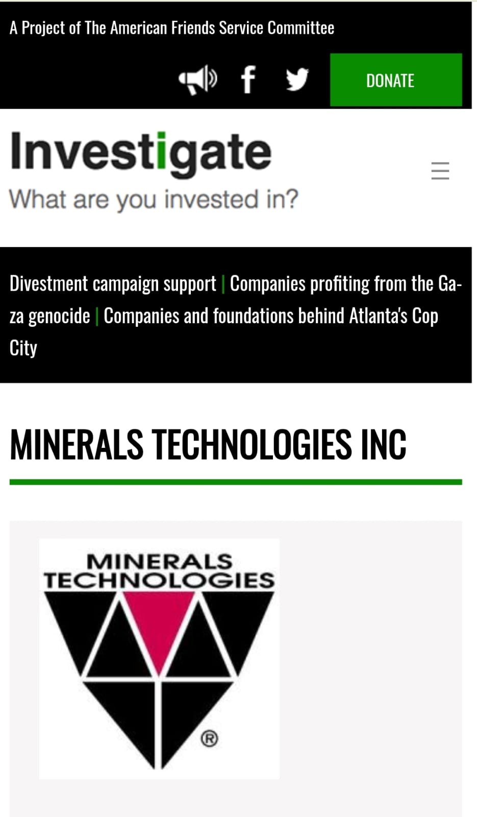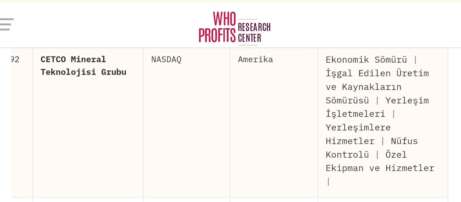İsrail'in Filistin ve Suriye topraklarına yönelik devam eden işgallerinde İsrailli ve uluslararası şirketlerin ticari katılımlarını ortaya çıkarmayı amaçlayan bağımsız bir araştırma merkezi olan "Who Profits" Araştırma Merkezi'nin raporlarına dayandırılan listede yer alan yabancı firma, Minerals Technologies Inc. grubuna bağlı CETCO firması oldu.
