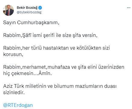 Adalet Bakanı Bekir Bozdağ, “Sayın Cumhurbaşkanım, Rabbim,Şâfî ismi şerifi ile size şifa versin, Rabbim,her türlü hastalıktan ve kötülükten sizi korusun, Rabbim,merhamet,muhafaza ve şifa elini üzerinizden hiç çekmesin...Âmîn. Aziz Türk milletinin ve bilumum mazlumların duası sizinledir” dedi.