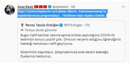 Cumhurbaşkanı Recep Tayyip Erdoğan, “Bugün hafif belirtiler üzerine eşimle birlikte yaptırdığımız COVID-19 testimizin sonucu pozitif çıktı. Omicron varyantı olduğunu öğrendiğimiz hastalığı hamdolsun hafif geçiriyoruz. Görevimizin başındayız. Çalışmalarımıza evde devam edeceğiz. Dualarınızı bekliyoruz” açıklamasının ardından sosyal medyada gündem oldu.