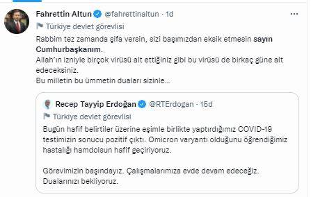 İletişim Başkanı Fahrettin Altun, “Rabbim tez zamanda şifa versin, sizi başımızdan eksik etmesin sayın Cumhurbaşkanım. Allah’ın izniyle birçok virüsü alt ettiğiniz gibi bu virüsü de birkaç güne alt edeceksiniz. Bu milletin bu ümmetin duaları sizinle…” ifadelerini kullandı.