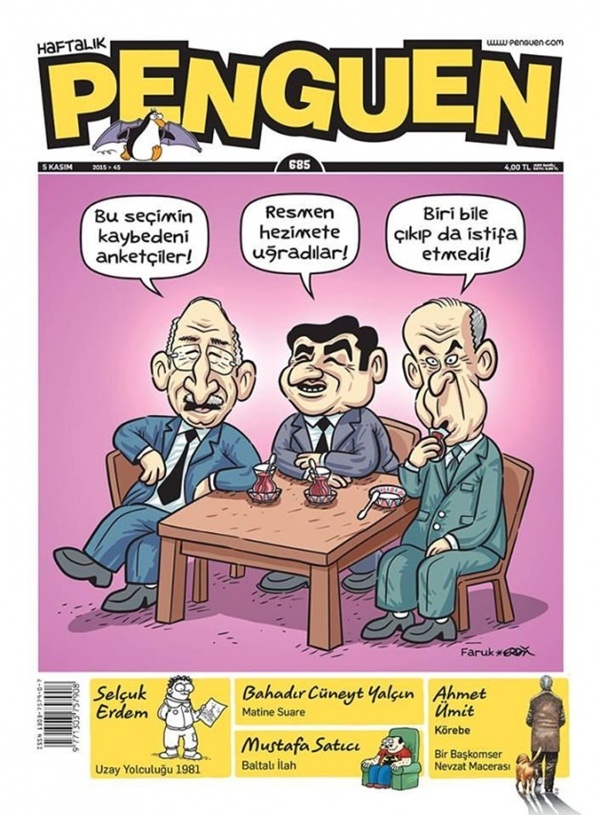Haftalık mizah dergisi Penguen bu haftaki kapağında 1 Kasım seçim sonuçlarına yer verdi ve muhalefetin durumunu alaya aldı.