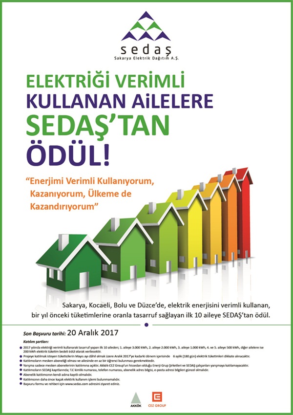 SEDAŞ Elektrik Dağıtım A.Ş. (SEDAŞ) enerji tasarrufu hakkında farkındalık oluşturmak amacıyla başlattığı projelere bir yenisini ekledi. Sakarya, Kocaeli, Bolu ve Düzce’deki daha önce ilköğretim öğrencilerine yönelik ‘Enerjinin Güvenli Kullanımı’ konulu eğitim seminerleri vererek resim yarışması düzenleyen SEDAŞ, şimdi de enerjinin verimli kullanımı ve gereksiz yere kullanımının engellenmesi ve enerji tasarrufunun teşvik edilmesini sağlamak amacıyla ‘Enerjimi verimli kullanıyorum, kazanıyorum, ülkeme de kazandırıyorum’ adlı projeyi hayata geçiriyor. Proje kapsamında 2016 yılına oranla 2017 içerisinde konutlarında en fazla elektrik tasarrufu yapan 10 ailenin belirli miktardaki elektrik tüketimi bedeli SEDAŞ tarafından karşılanacak.