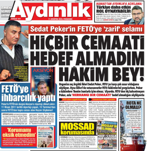 Vatan Partisi Genel Sekreteri Özgür Bursalı, dün akşam sosyal medya hesabından, Aydınlık'ın bugünkü manşet haberinin duyurusunu yaparak, "Sedat Peker'in duruşma salonlarında FETÖ'ye yolladığı "zarif" selamlar tek tek, belgeleriyle yarın (11 Ağustos) Aydınlık'ta yayınlanacak. Twitterlarda racon kestiğini sanan çakalların FETÖ'ye nasıl el pençe olduğunu okuyacaksınız. Aydınlıkçılarla ve gerçekle başa çıkamazsınız." dedi.