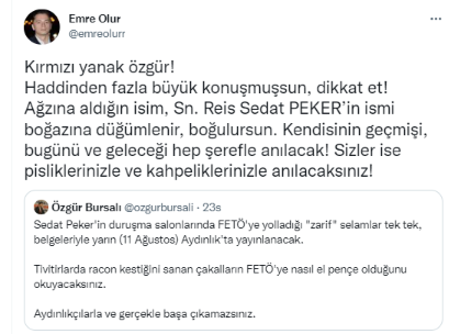 Sedat Peker'in "basın danışmanı" olarak tanınan Emre Olur, Bursalı'yı şu ifadelerle tehdit etti: