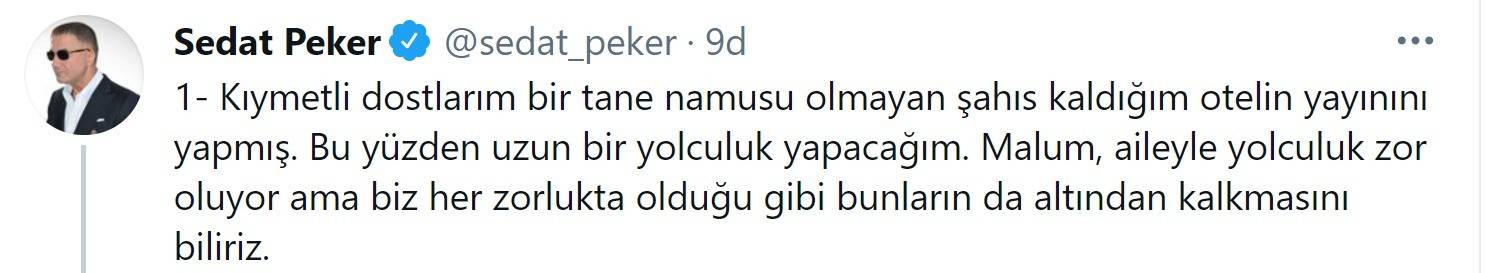 "Kıymetli dostlarım bir tane namusu olmaya şahıs kaldığım otelin yayınını yapmış. Bu yüzden uzun bir yolculuk yapacağım. Malumi aileyle yolculuk zor oluyor ama biz her zorlukta olduğu gibi bunların da altında kalkmasını biliriz."