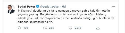 Sedat Peker yakalandı mı? Sedat Peker, Twitter’dan yaptığı son paylaşımında kaldığı ülkeden de kaçacağını söylemişti. Peker’in sosyal medya paylaşımı: “Kıymetli dostlarım bir tane namusu olmayan şahıs kaldığım otelin yayınını yapmış. Bu yüzden uzun bir yolculuk yapacağım.” İşte organize suç lideri Sedat Peker'in Twitter paylaşımları: