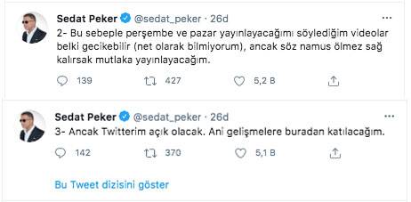 Organize suç lideri Peker, sosyal medya paylaşımında video paylaşımlarının devam edip etmeyeceği konusunda şuları söylemişti: “Perşembe ve pazar yayınlayacağımı söylediğim videolar belki gecikebilir (net olarak bilmiyorum), ancak söz namus ölmez sağ kalırsak mutlaka yayınlayacağım.”