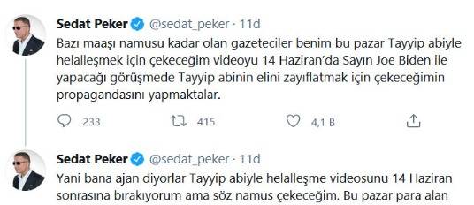 Sedat Peker; ABD Başkanı Joe Biden ile Cumhurbaşkanı Recep Tayyip Erdoğan’ın görüşmesi öncesinde, Türkiye’nin elini zayılatma amacı ile, pazar günü video çekeceği eleştirilerine karşı, vatanı düşünüyormuş rolleri ile karar değişikliği yaptığını, Erdoğan’a yönelik videoyu daha sonra çekeceğini ileri sürerek, bu hafta ise kendisinden 10 bin dolar maaş alan milletvekilini açıklayacağını iddia etti.