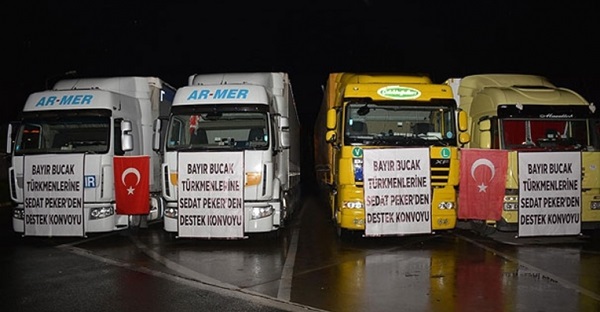 Sedat Peker, Suriye'nin Türkmen Dağı bölgesinde katil Beşşar Esed rejimine karşı büyük bir savaş veren Bayırbucak Türkmenlerine 4 TIR yardım gönderdi. Peker'in gönderdiği yardım TIR'larına 3 bin adet battaniye, askeri kıyafet ve bot yüklendi.