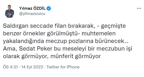 Özdil, silahlı saldırgana ilişkin şu ifadeleri kullanarak Peker'in sözcülüğüne soyundu: