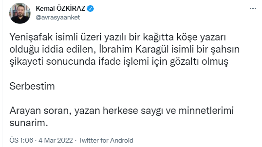 Aynı algıya başvuran Kemal Özkiraz, "İbrahim Karagül isimli bir şahsın şikâyeti sonucunda ifade işlemi için gözaltına alındım." dedi. Özkiraz'ın yine emniyetin ifade davetine karşılık vermediği öğrenildi.