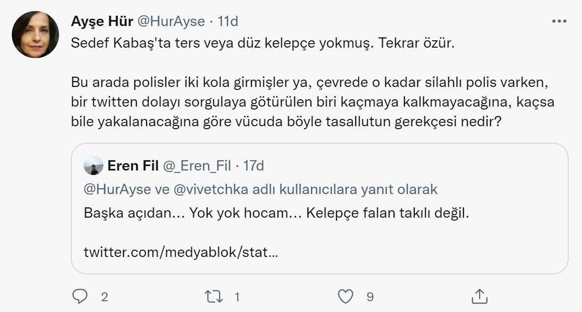 "Sedef Kabaş'ta ters veya düz kelepçe yokmuş. Tekrar özür. Bu arada polisler iki kola girmişler ya, çevrede o kadar silahlı polis varken, bir twitten dolayı sorgulamaya götürülen biri kaçmaya kalkmayacağına, kaçsa bile yakalanacağına göre vücuda böyle tasallutun gerekçesi nedir?"