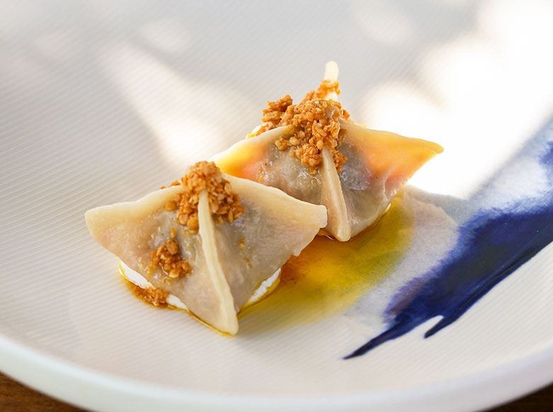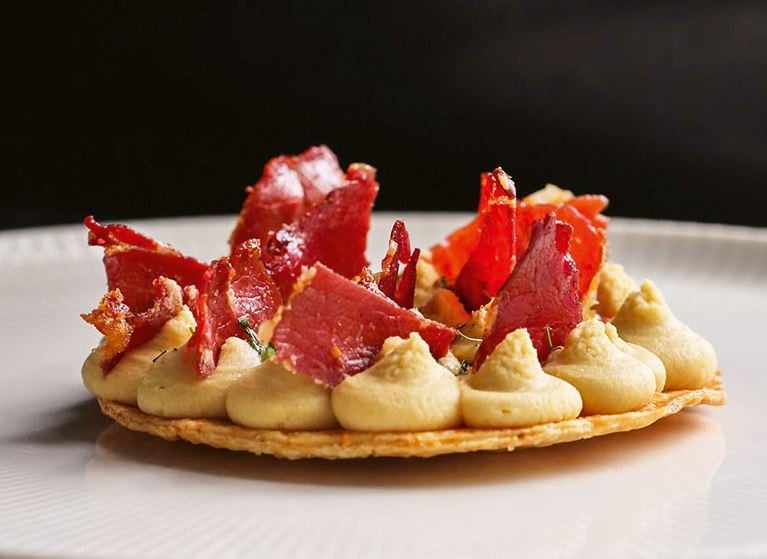 Yapılışı: Baklalar ıslatılır, yumuşayınca süzülür. Tencerede zeytinyağında soğan, havuç ve kabak kavrulur. Üzerine gambilya baklası eklenerek kısa bir süre daha kavrulmaya devam edilir. Daha sonrasında tuz ve limon suyu ilave edilir. Kontrollü su eklenerek gambilyalar dağılıncaya kadar pişirilir. Piştikten sonra blender’dan, daha sonra da tel süzgeçten geçirilir. Parmesanlı sable için; Tüm malzemeler karıştırılıp hamur haline getirilir. Daha sonra merdane yardımı ile hamur açılır ve çember yardımıyla yuvarlak şekilde kesilip 180 derecelik fırında 10-12 dakika pişirilir. Sable hamurunun üzerine sıkma torbasına konulan gambilya favası sıkılır, üzerine tereyağında çıtırlaştırılmış pastırmalar eklenerek servis edilir.