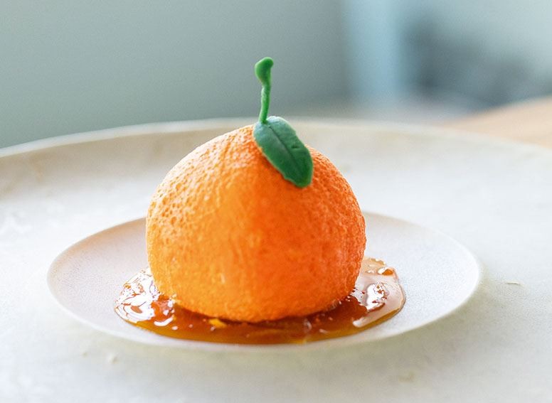 Yapılışı: Jelatinler soğuk suda bloom edilir. Süt, krema, şeker ocakta kaynatılır. Jelatinler sudan çıkarılarak süzülür, kaynayan süte ilave edilip karıştırılır. Tereyağı tavaya alınıp ısıtılır, içine lime kabuklar eklenerek hafif kokusu çıkana kadar ocakta tutulur ve sütlü karışıma ilave edilip karıştırılır. Mandalina kalıbına yarısı olacak şekilde doldurulur ve dondurucuda yarım saat bekletilir. Dondurucudan çıkan mandalina üzerine kesilmiş çikolata ve krokan saplanarak konur ve üzerine tekrar sütlü karışım ilave edilerek doldurulur. Ve dondurucuya atılıp dondurulur. Mandalina sosu için; Portakal zest yapılır, suyu ile birlikte tencereye alınır. İçine şeker ilave edilip özdeşleşene kadar pişirilir. En son bal ilave edilir. Dal ve yapraklar için; Beyaz çikolata benmarie usulü eritilir içine yeşil gıda boyası ilave edilir karıştırılır. Yağlı kağıtla üzerinde şablon yapılır ve dondurulur. Tabaklama için; Mandalinalar kalıptan çıkartılır. En altına mandalinanın sosundan dökülür. Daha sonra kalıptan çıkarttığımız mandalina kadife gıda sprey boyası ile boyanır ve tabağa dökmüş olduğumuz mandalinalı sosun üzerine mandalinalar konulur. Üzerine yaprak ve dalı entegre edilerek servise sunulur.