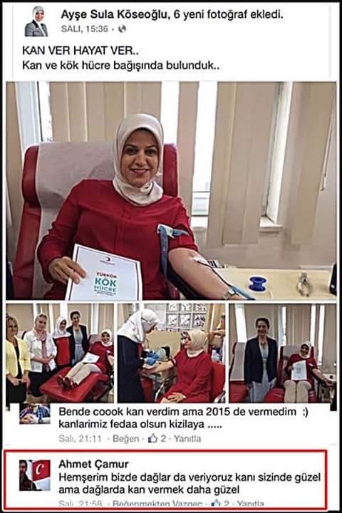 Kızılay’a kan veren AK Parti Trabzon Milletvekili Ayşe Sula Köseoğlu’nun 11 Ağustos Salı günü kendi sayfasında yaptığı "Kan ve hayat ver" paylaşımına Çamur “Hemşerim bizde dağlarda veriyoruz kanı, sizin de güzel ama dağlarda kan vermek daha güzel” yazması dikkat çekti.
