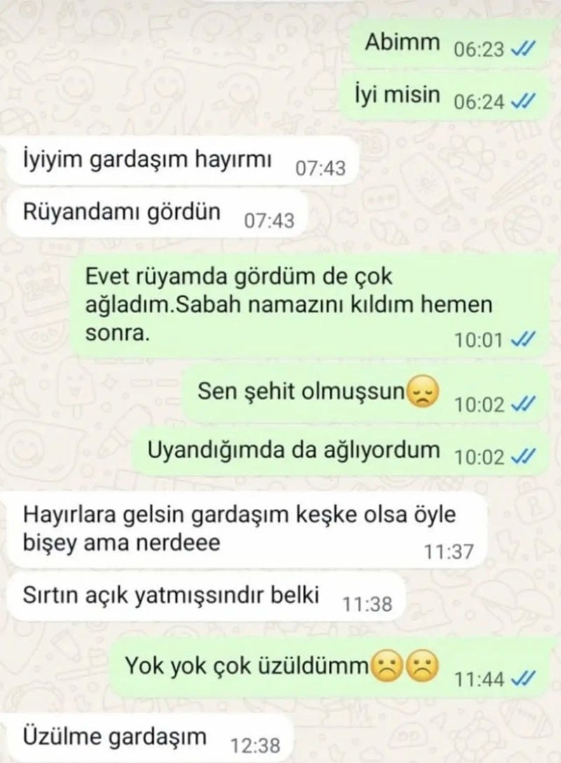 WhatsApp konuşmasında kız kardeşinin, rüyasında abisinin şehit olduğunu gördüğünü ve bu nedenle çok üzüldüğünü söylediği görüldü. Kuyucu’nun ise, “Keşke öyle olsa” demesi yürekleri dağladı.