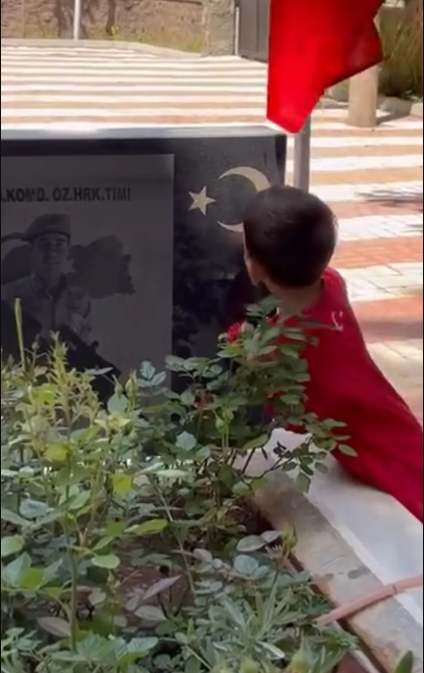 Şehit Jandarma Uzman Çavuş Sezer Uçar'ın 3 yaşındaki yeğeni Sezer, amcasının mezarını suladı, fotoğrafını öptü.