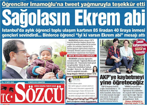 İmamoğlu ve tayfası, şehit çocuklarının daha kolay ulaşım hakkı olması için indirim yaptıklarını iddia etti. Sözcü de bunu manşetten vererek işi duygu sömürüsüne vurdu.
