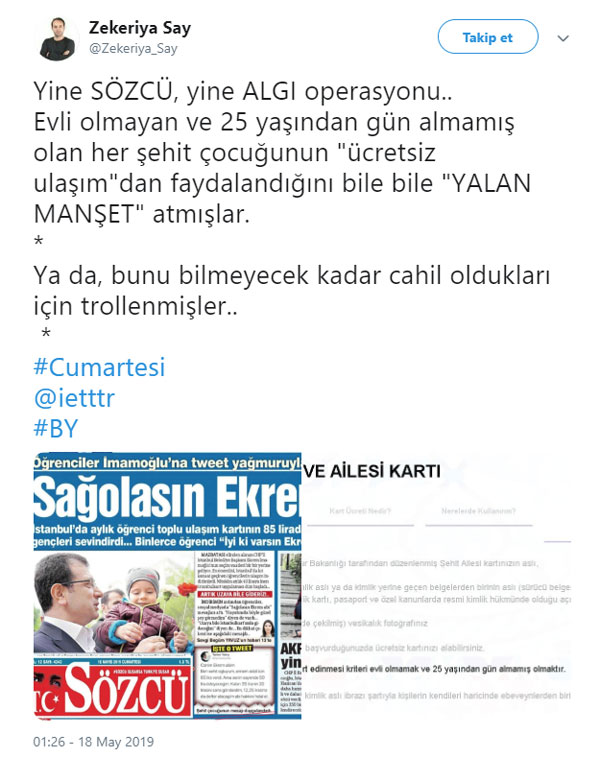 Sözcü'nün haberini sosyal medya hesabından paylaşan yeniakit.com.tr yazarı Zekeriya Say, "Yine Sözcü, yine algı operasyonu.. Evli olmayan ve 25 yaşından gün almamış olan her şehit çocuğunun 'ücretsiz ulaşım'dan faydalandığını bile bile 'yalan manşet' atmışlar. Ya da, bunu bilmeyecek kadar cahil oldukları için trollenmişler.." ifadesini kullandı.