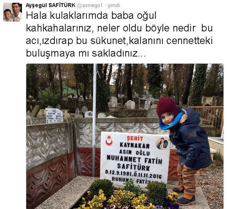 Şehit Derik Kaymakamı Muhammet Fatih Safitürk'ün eşi Ayşegül Safitürk sosyal medya hesabından Sakarya'nın Arifiye İlçesi'ndeki babasının mezarını ziyaret eden oğlu 3 yaşındaki Asım Eren'in fotoğrafını paylaştı. Ayşegül Safitürk, "Hala kulaklarımda baba oğul kahkahalarınız, neler oldu böyle, nedir bu acı, ızdırap, bu sükunet, kalanını cennetteki buluşmaya mı sakladınız" sözlerini paylaşması yürekleri burktu. Ayşegül Safitürk'ün paylaşımı çok sayıda kişi tarafından sosyal medyada paylaşıldı.