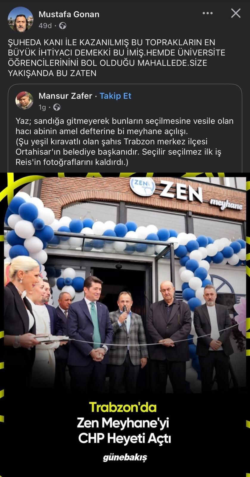 Hizmet anlayışı heykelden öteye geçmeyen ancak kadına taciz ve tecavüzde, yolsuzluk ve hırsızlıkla gündemi meşgul eden CHP, bu kez her bir karış toprağı şehit kanıyla sulanan Trabzon'da meyhane açtı.