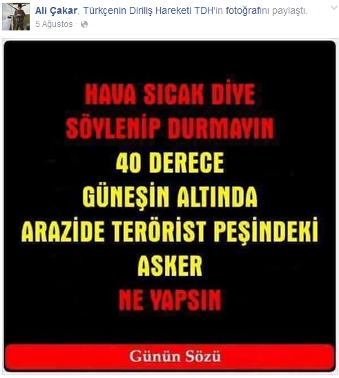 Şehit Jandarma Uzman Çavuş Ali Çakar'ın Facebook'taki bir paylaşımı ise dikkat çekti. Çakar, "Hava sıcak diye söylenip durmayın. 40 derece güneşin altında arazide terörist peşindeki asker ne yapsın?" paylaşımı ile sıcak havalardan dert yananlara sitem etmiş.