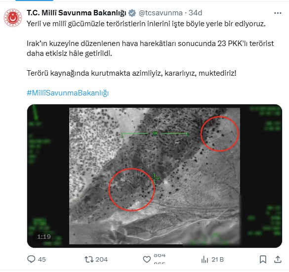 Bakanlık açıklamasında, “Irak’ın kuzeyine düzenlenen hava harekâtları sonucunda 23 PKK'lı terörist daha etkisiz hâle getirildi. Terörü kaynağında kurutmakta azimliyiz, kararlıyız, muktediriz.” denildi.
