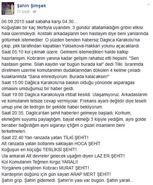 Dağlıca'daki kanlı saldırıdan şan eseri kurtulan isimlerden birisi de Şahin Şimşek isimli asker. 20 yaşındaki Şimşek, Dağlıca saldırısının yapıldığı gün neler yaşadığını sosyal paylaşım sitesi Facebook'taki hesabından paylaştı.