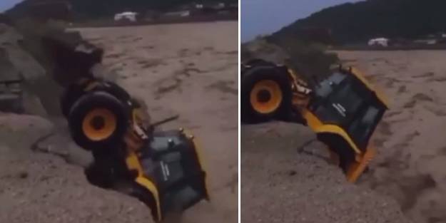 Sel suları kepçeyi böyle yuttu! Operatör son anda kurtuldu