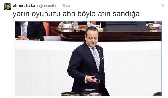 Ahmet Hakan, Egemen Bağış'ı göstererek oy kullanma biçimini tarif etti. SelahattinDemirtaş da oy kullanmadan önce zarfı sandığın üzerine fırlattı.