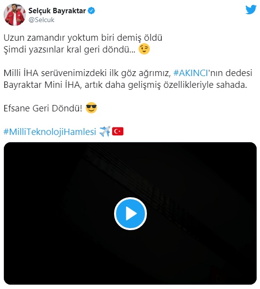 Selçuk Bayraktar paylaşımda, "Uzun zamandır yoktum biri demiş öldü. Şimdi yazsınlar kral geri döndü... Milli İHA serüvenimizdeki ilk göz ağrımız, #AKINCI'nın dedesi Bayraktar Mini İHA, artık daha gelişmiş özellikleriyle sahada. Efsane Geri Döndü!" açıklamalarına yer verdi.